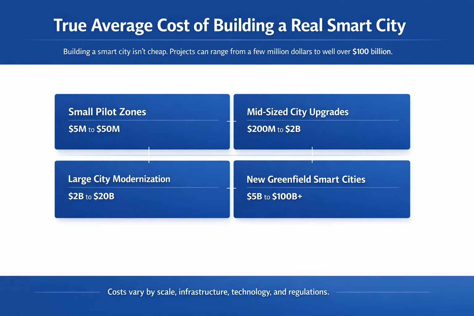 Das ist ein breites Spektrum, und das aus gutem Grund. Die Kosten einer Smart City hängen von mehr als nur der Quadratmeterzahl ab. Sie werden maßgeblich durch den Umfang des Projekts, den Reifegrad der Infrastruktur, den Technologie-Stack, die regulatorischen Rahmenbedingungen und die Art der angestrebten “Intelligenz” bestimmt.