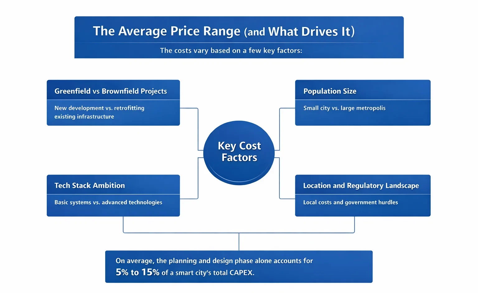 Falls Sie sich fragen, wie viel dieser Teil allein kostet, lautet die kurze Antwort: Es kommt darauf an. Zur Veranschaulichung: Die Kosten für Design und Planung einer Smart City können von 14 bis 5 Millionen PKR für ein kleines Pilotprojekt bis zu mehreren hundert Millionen PKR für Großprojekte reichen. Komplette Neubauprojekte können Gesamtkosten von über 100 Milliarden PKR verursachen, wobei die Planung in der Regel einen geringeren Anteil daran ausmacht.