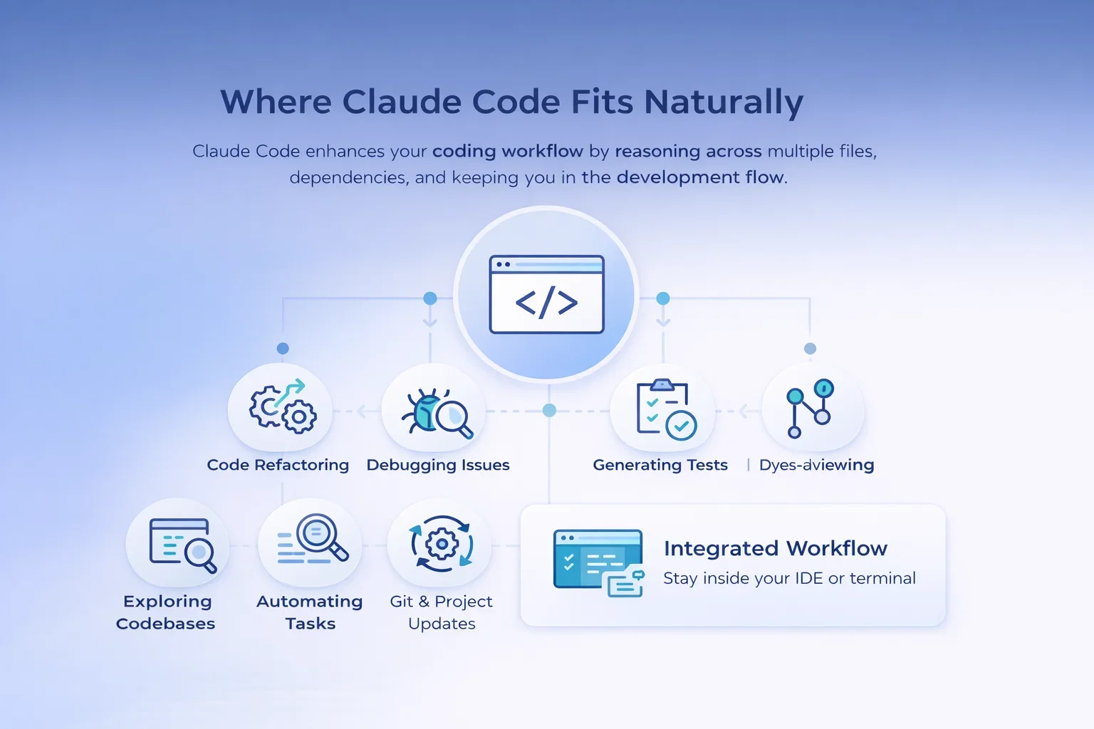 Claude Code wordt pas echt zinvol als je werk draait om code. De kracht ervan schuilt in de context. Omdat het een volledig project kan overzien, kan het redeneren over meerdere bestanden, afhankelijkheden begrijpen en gecoördineerde wijzigingen doorvoeren die normaal gesproken handmatige inspanning zouden vereisen.