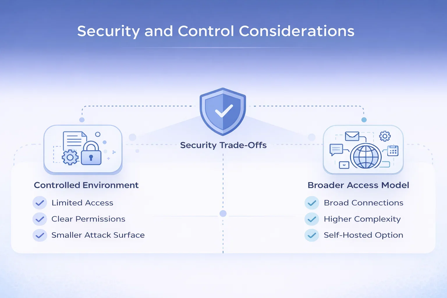 OpenClaw kan daarentegen verbinding maken met e-mailaccounts, berichtenplatforms, agenda's en acties op systeemniveau. Die flexibiliteit brengt echter ook meer verantwoordelijkheid met zich mee. Het draaien van een persistente agent met brede machtigingen vereist zorgvuldige configuratie, de juiste toegangscontrole en aandacht voor updates.